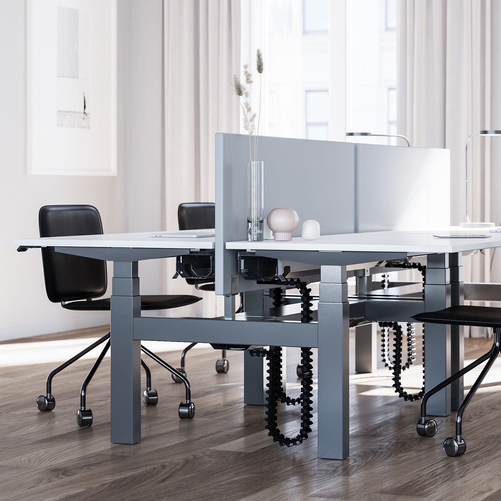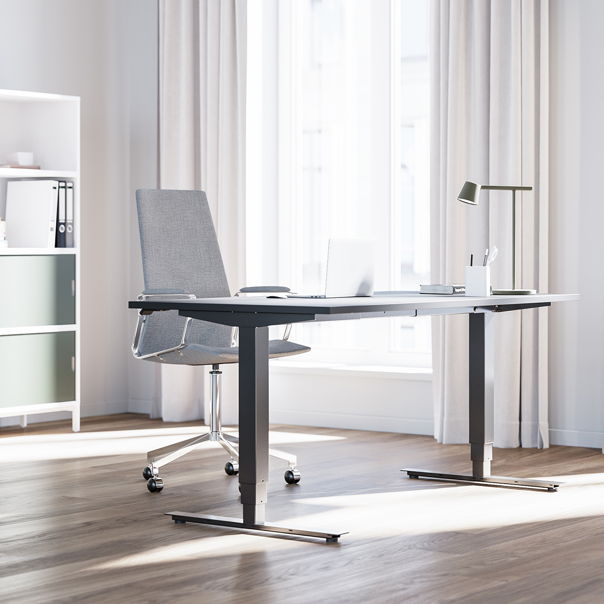 No one is made from the same mould: this is what underpins our height-adjustable frame concept. We want to encourage users to change their working position, since a number of studies show that such an approach can have several health benefits, as well as making us feel better as we work. When you have plenty to do and no time to stretch your legs at work, a standing working position is a good alternative.